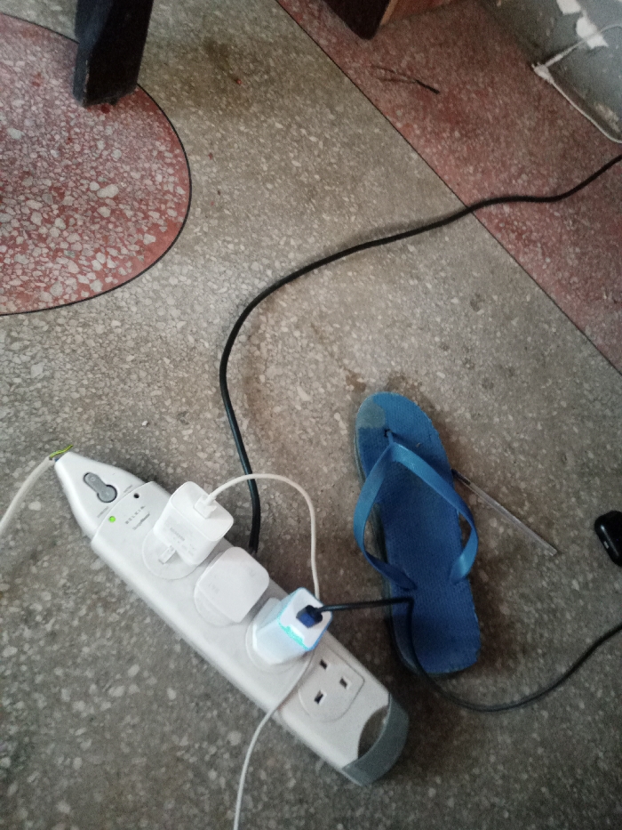 An overhead view captures a section of an indoor floor, likely in the city of Unknown, Unknown. The floor consists of speckled grey and reddish-pink terrazzo or polished concrete with distinct circular patterns. A white Belkin surge protector power strip is positioned diagonally on the floor, exhibiting an illuminated green power indicator light. Three white power adapters are plugged into the surge protector; one adapter displays a blue illuminated LED. Multiple electrical cables, including thin white and thick black strands, extend from the surge protector and across the floor. To the right of the power strip, a single blue, worn flip-flop rests on the floor. A clear plastic ballpoint pen is partially visible beneath the strap of the flip-flop. A small, dark electronic object is partially visible in the bottom right quadrant of the image. No individuals or animals are present in the scene.