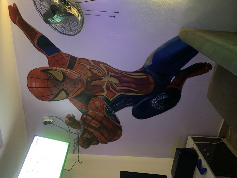 This image depicts an indoor room in Kubwa, Nigeria, characterized by a prominent full-body mural of Spider-Man painted on a light purple wall
