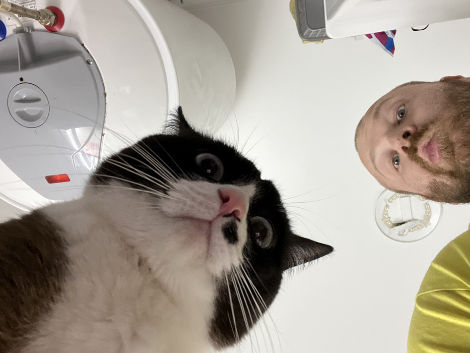 A low-angle shot features a curious black and white cat with wide eyes and a pink nose, positioned in the lower left. Above and to the right, a man with a short beard peers down with pursed lips. In the background, a white wall holds a water heater on the left and a circular light fixture to the right of the man. A yellow shirt appears in the lower right corner, suggesting another person or element is present.