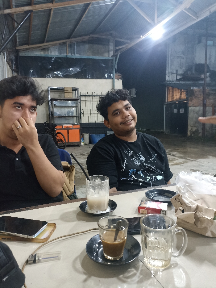 The image captures a nighttime scene at a casual, semi-outdoor establishment, likely a cafe or eatery, in Lhokseumawe, Indonesia. Two males are seated at a light-colored table. The male on the left, with dark hair and a black polo shirt, has his right hand partially covering his mouth, revealing a silver ring on his ring finger, and is looking upwards and to the right. The male on the right, with dark curly hair and a black t-shirt with white graphics, is smiling and looking directly at the camera. A third person's index finger is visible entering the frame from the far right. On the table are several items: a smartphone with a light-colored case and an attached cable leading to a clear plastic lighter; a tall, half-empty glass of a light-colored, foamy beverage with a black straw on a black saucer; a small glass of dark coffee with a spoon on a black saucer; an empty, clear glass mug; a red and white cigarette pack; a crumpled brown paper bag; and a black plate. The background reveals a corrugated metal roof structure supported by wooden beams, illuminated by a bright overhead light fixture on the right. Behind the individuals, a light-colored wall is visible, featuring a metal shelving unit with an orange base and wheels, a metal gate section, and a blue barrel. Further to the right, a brick structure with a lower entryway is discernible in the dark background.