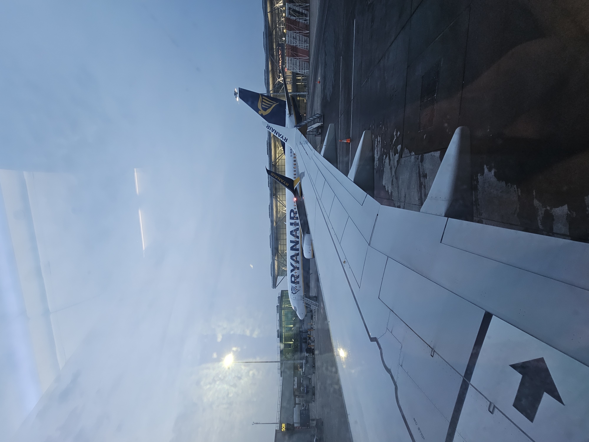 The image depicts an airport apron scene viewed from an aircraft window