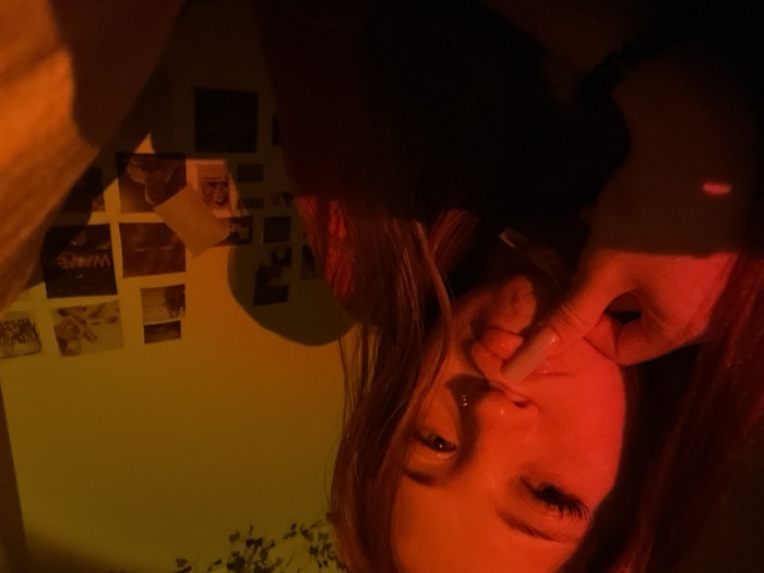 A young female is depicted in an indoor setting, illuminated by dual-toned artificial lighting