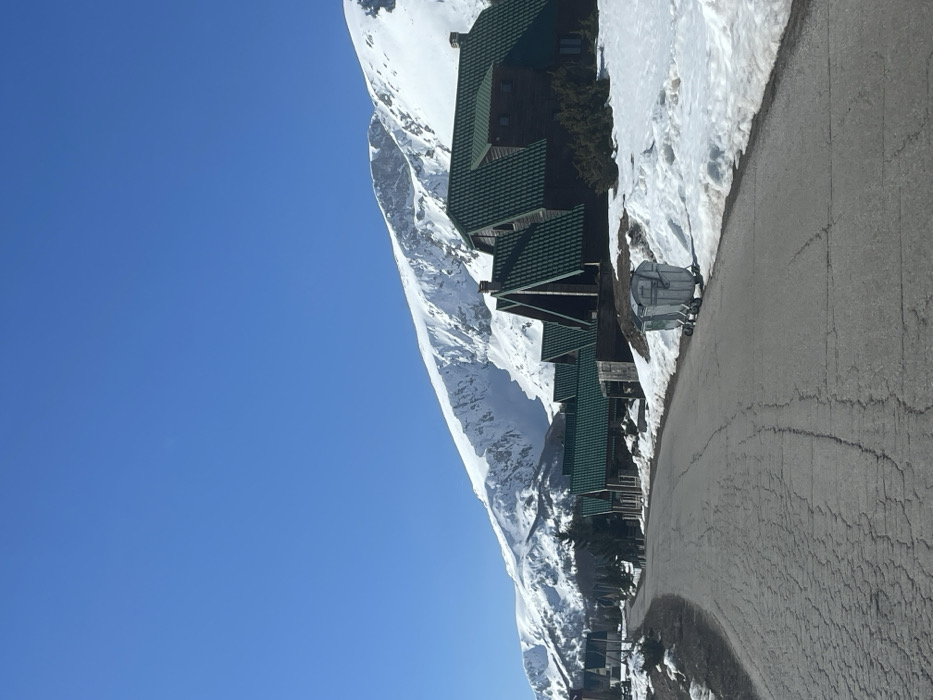 The scene depicts a snow-covered mountainous landscape in Motički gaj, Montenegro, under a clear, bright blue sky. An asphalt road, cracked and weathered, curves from the foreground to the left into the midground. To the right of the road, multiple chalet-style buildings with dark wooden exteriors and distinctive steep, gabled roofs with dark green tiling are situated on snow-covered ground. Two light-colored, wheeled refuse bins are positioned on the snow immediately adjacent to the right side of the road. Further into the background, large, snow-covered mountains with visible rock formations dominate the horizon. Patches of snow cover the ground surrounding the buildings and along the road, with some sparse vegetation visible where snow has receded. No individuals, animals, or vehicles are present.