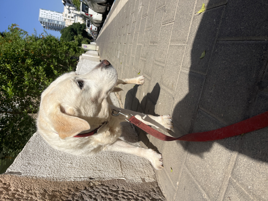 A cream-colored Labrador-type dog, wearing a red collar and attached to a red leash, stands on a grey paved sidewalk. The dog faces towards the right of the frame, its gaze slightly downward. To the immediate left is a textured, light-colored wall. Strong, dark shadows of the dog and an unseen individual holding the leash are cast on the sunlit sidewalk, which has scattered green leaves. In the background, a street is visible, lined with parallel-parked cars, predominantly white and silver. Further back, green trees and multiple light-colored, modern urban buildings are present under a clear blue sky. A distinct white high-rise building with a grid of windows is prominent on the distant horizon. The scene depicts a sunny day in an urban setting characteristic of Tel Aviv, Israel.