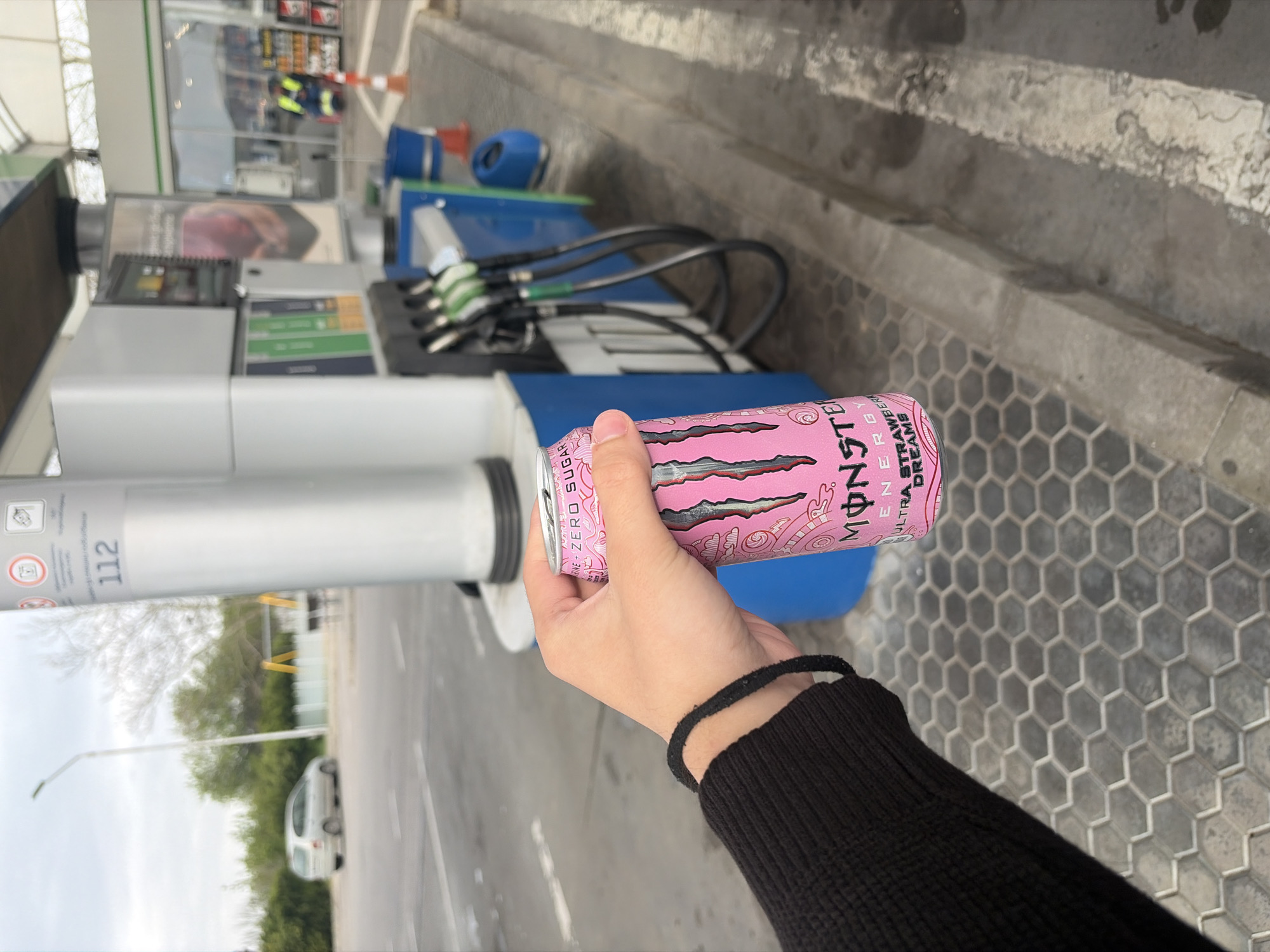 A person is holding a pink Monster energy drink can in their right hand at a gas station. The gas station has silver pumps with black hoses. In the background, a road and trees can be seen. The ground is paved with grey hexagonal tiles. The person is wearing a black long-sleeved shirt and a black bracelet is visible on their wrist. The can is labeled "ULTRA STRAWBERRY DREAMS." The scene is oriented sideways relative to the viewer. Based on the available information, the location is Popovitsa, Bulgaria.