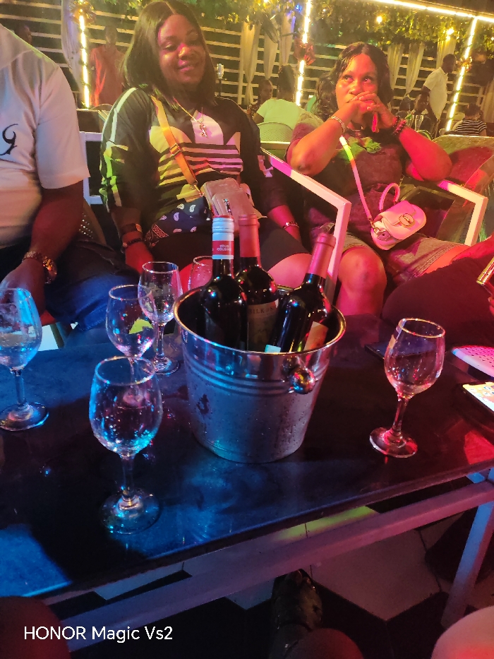 A group of people sits around a table with an ice bucket filled with wine bottles. Wine glasses are scattered on the table, some partially filled. Two women are prominently seated, one in a patterned black and white shirt and the other in a reddish-brown outfit. A person in a white shirt is partially visible. The setting appears to be a bar or restaurant, with a mix of indoor and outdoor space, potentially a rooftop with atmospheric lighting.