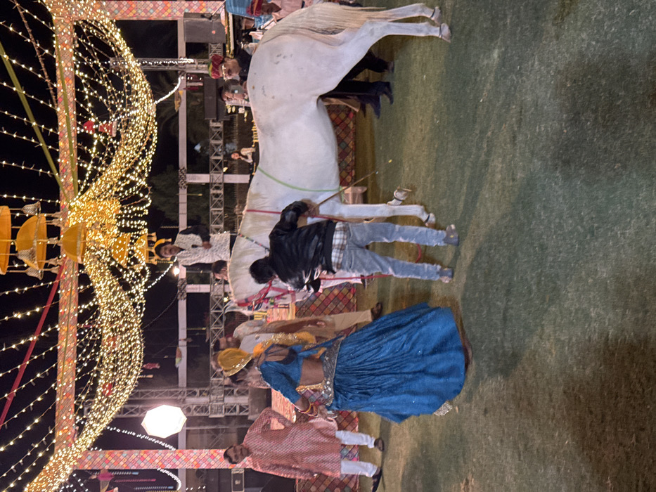 Captured at night, the image features a white horse, likely part of a wedding procession. A man in a black jacket and jeans holds the reins. Several people are gathered around, including a woman in a vibrant blue dress and a man in a patterned shirt and white pants. A Ferris wheel-like structure, adorned with numerous glowing lights, dominates the left side of the frame. A tiered stage is visible in the background. The scene suggests a festive, celebratory atmosphere.