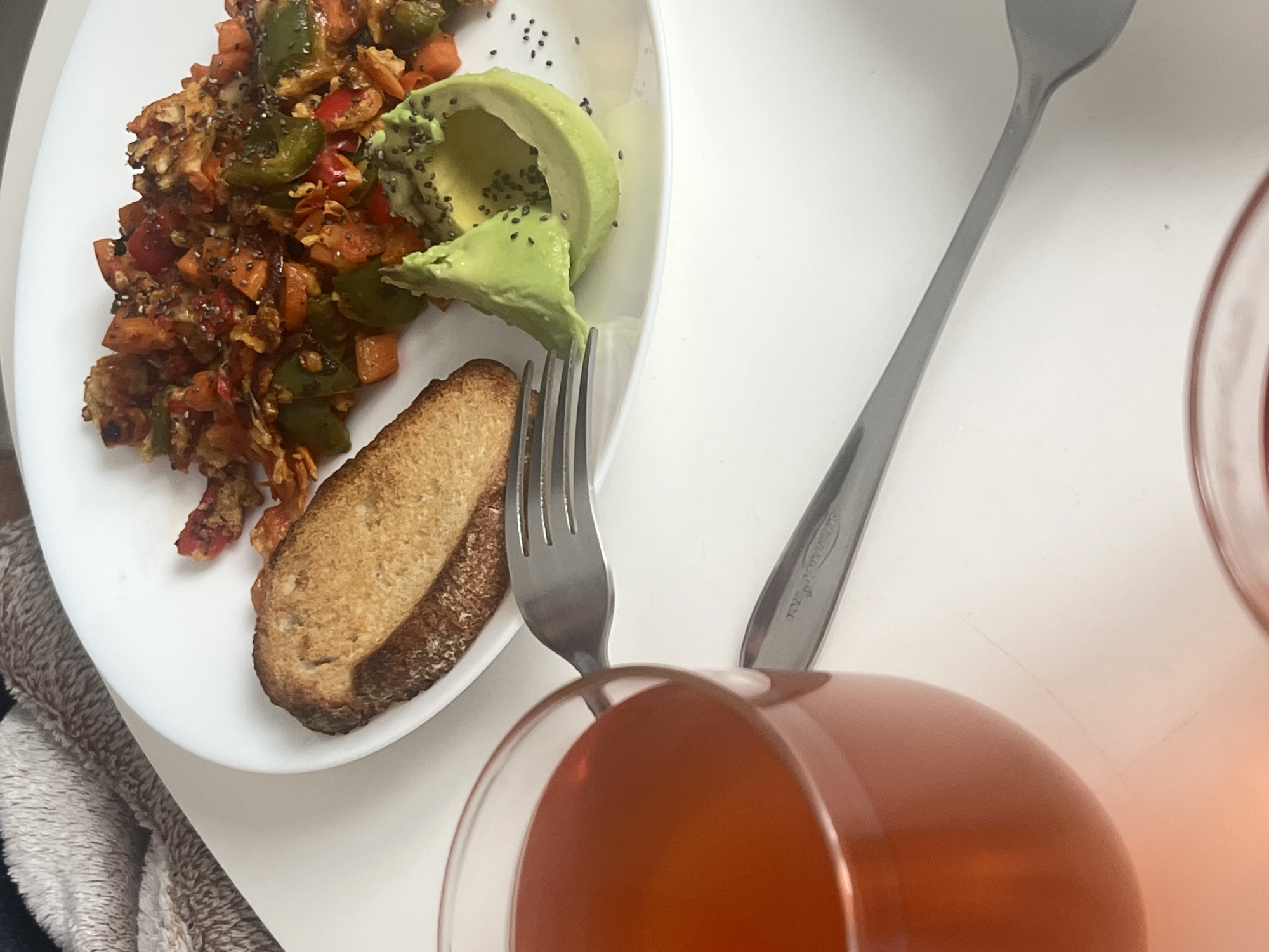 A top-down shot reveals a white plate filled with food. The plate contains a mix of sautéed vegetables, a slice of toast, and avocado slices sprinkled with seeds. Next to the plate are a fork, a spoon, and a partially visible glass containing a reddish liquid. The scene is indoors and located in an unidentified part of the city of Mogán, Spain.