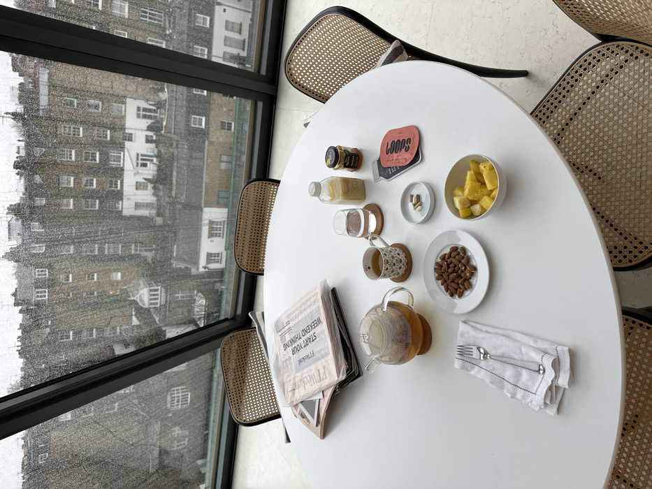The image depicts a high-angle view of a modern dining area in a building located in the city of London, United Kingdom. A large, angled window, visibly streaked with rain, overlooks a dense urban landscape characterized by traditional terraced houses with brick facades and varying rooflines. In the foreground, a white, round table is furnished with breakfast or snack items for one individual. Centrally positioned is a clear glass teapot containing amber-colored tea, accompanied by a patterned ceramic mug on a wooden coaster. To its right, a glass of water sits on another wooden coaster, next to a clear plastic bottle of yellow liquid (likely a juice or smoothie) and a small jar with amber contents, possibly honey or a preserve. A small white dish holds two brown capsules or pills. Two red coasters with "LOOPS" branding are stacked nearby. A white plate filled with almonds is positioned on the left side of the table, and a white bowl containing diced pineapple is on the right. A silver fork rests on a folded white napkin with red stitching. Partially obscured on the far side of the table is a folded newspaper, identifiable as "FT WEEKEND" (Financial Times Weekend edition) with the headline "START YOUR WEEKEND THINKING." Four chairs with natural cane backs and dark frames are arranged around the table, three of which are fully or partially visible. The flooring appears to be light-colored tile. No individuals are present in the scene.