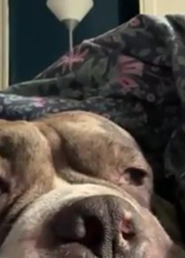 A dog is lying in bed under a floral blanket, looking up with wide eyes. The dog's face is mostly white with some brown patches. The blanket is predominantly blue with pink and green floral patterns. A white floor lamp is visible in the background. Some pictures are hanging on the wall. The room appears to be a bedroom.