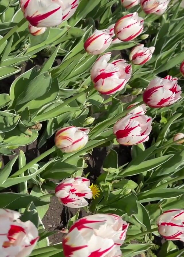 flowerbed filled with red and white striped tulips
