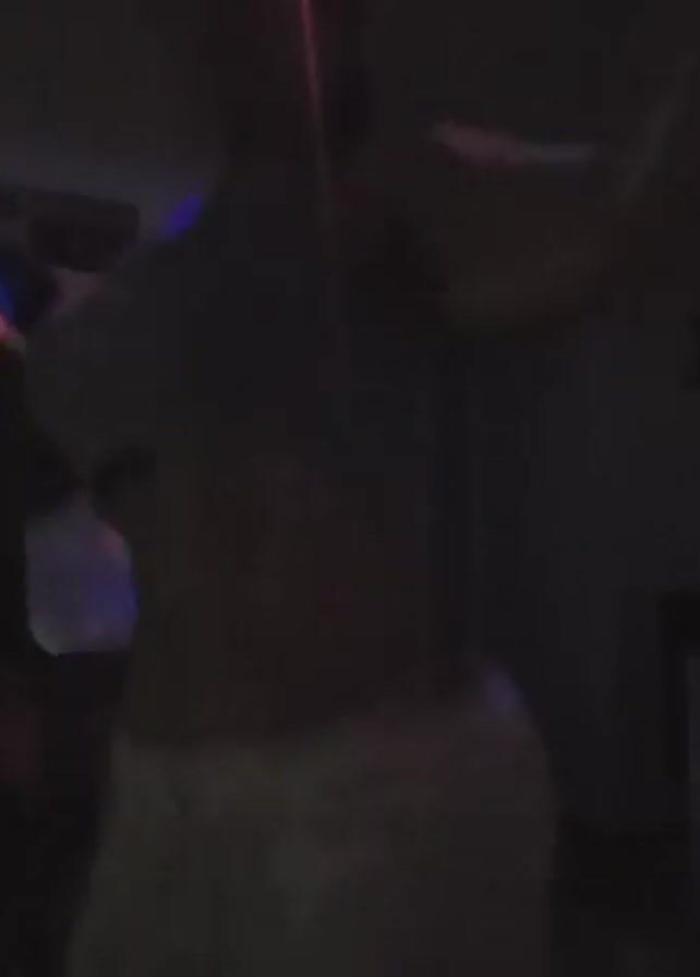 The video is shot in a dark room, possibly a club or party setting, with a disco ball casting colored lights. Two individuals are discernible. A woman is visible from the mid-torso down, wearing a light-colored top and pants. She appears to be dancing, moving her body to the music. To her left, there's a dark-skinned man, mostly in silhouette, seemingly watching her. The overall environment is dimly lit and active with the sounds of music and movement.