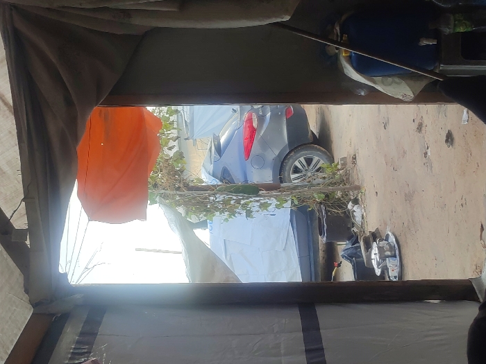 The image, captured from within a makeshift shelter in Khan Yunis, Palestinian Territory, depicts an outdoor scene viewed through a doorway. The interior of the shelter features light-colored fabric walls, with a blue plastic water container draped in a patterned cloth and resting on a stool in the lower right. A thin pole leans against this container. Beyond the doorway, an unpaved dirt ground extends, showing signs of wear and scattered debris. In the lower left-midground, a silver-colored tray holds a metal teapot and at least two small metal cups or bowls. Adjacent to this, several dark cooking pots or containers are visible, some resting on bricks. Centrally, a vertical post supports green vines from which elongated green fruits, possibly gourds, are suspended. Behind the vines, a dark grey or blue Hyundai SUV is parked, with its rear passenger side prominently visible, including the wheel. The front half of the vehicle is partially obscured by a light blue tarp. In the background, additional structures constructed from light-colored tarps are discernible. An orange tarp is stretched overhead in the upper-midground, while a bright, overcast sky with faint power lines is visible above the distant structures. No individuals are present in the frame.