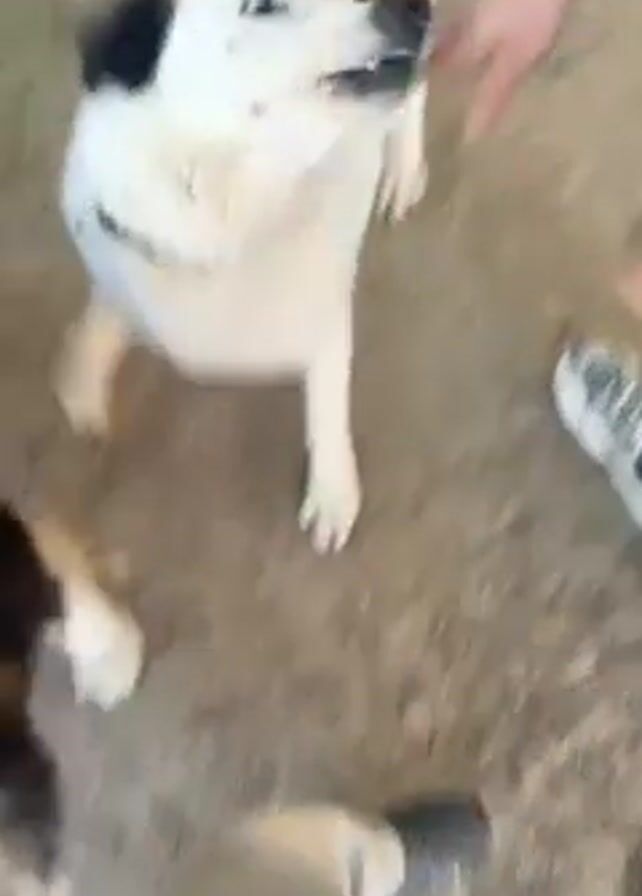 A person in a navy blue tracksuit is standing outside on a dirt surface. The person calls a white dog with black markings, who appears excited. Then a fluffy black dog approaches and the person pats the black dog on the back. The person then steps away from the dogs.