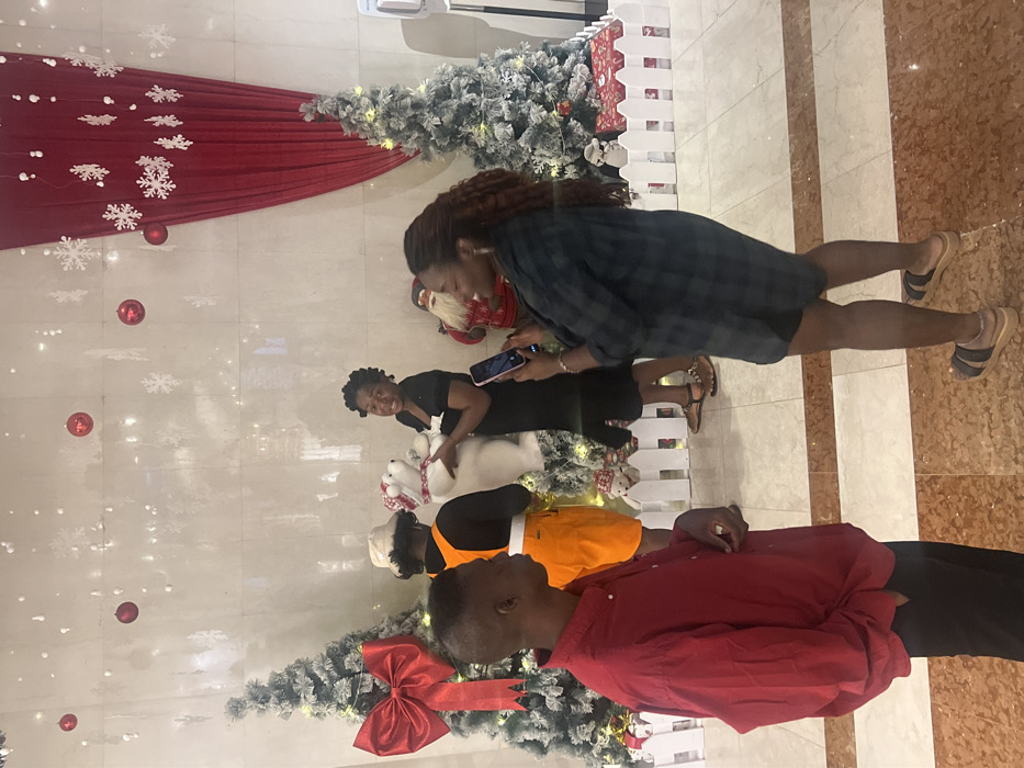 A group of four people pose in front of a Christmas display. The display features Christmas trees with red bows, a red backdrop with white snowflakes, and a white picket fence. The person in the front wears a red shirt and black pants. Behind them is a person in an orange shirt. The next person wears a black dress. The last person wears a dark blue plaid shirt and holds a phone. Everyone is smiling or looking at the display. The floor is a light marble.