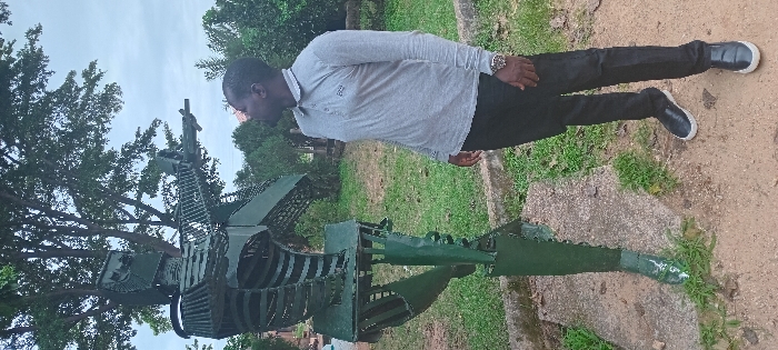 A man in a light gray long-sleeved shirt and dark pants stands next to a metal sculpture. The sculpture appears to be an abstract human figure with various metal components. The background includes trees and greenery, suggesting an outdoor park or garden setting. The ground is a mix of grass and dirt. The man is looking at the sculpture with a focused expression.