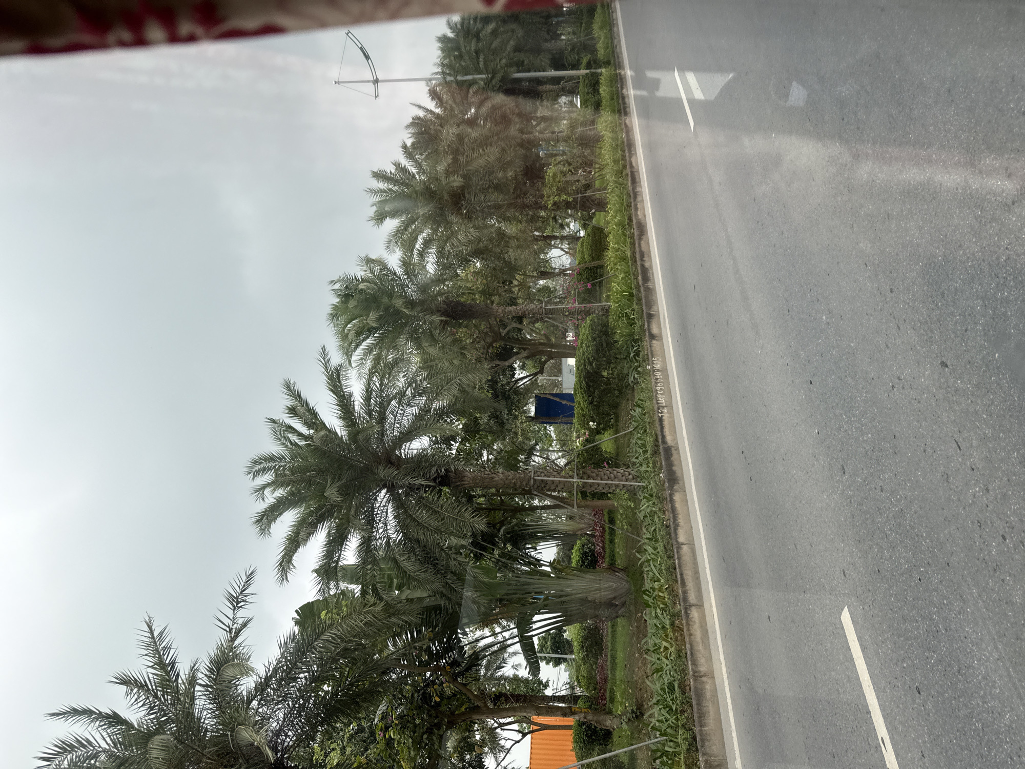 This image captures a wide-angle view from a vehicle, looking across an asphalt road towards a landscaped median strip in Hà Nội, Vietnam, under an overcast sky. The road surface is grey asphalt, exhibiting reflections, and features a single solid white lane marker on the left side of the visible pavement. A concrete curb separates the road from a green median, with a faint string of characters, '12 LLF0986+0415', visible on its upper surface in the lower mid-left. The median is densely planted with various tropical and subtropical vegetation. Numerous palm trees, some supported by metal stakes, dominate the midground. A prominent Traveler's Palm (Ravenala madagascariensis) stands centrally within the median. Smaller green trees, shrubs, and scattered plants with pink blossoms are also visible. In the background on the left, an orange structure, possibly a shipping container, is partially visible amongst the foliage. To the far right, a tall street light pole with an extended horizontal arm rises from beyond the median. The sky is uniformly light grey and cloudy. The foreground on the extreme right shows a blurred reddish-brown textured object, indicating the interior of the vehicle from which the photograph was taken. No individuals or explicit actions are depicted.