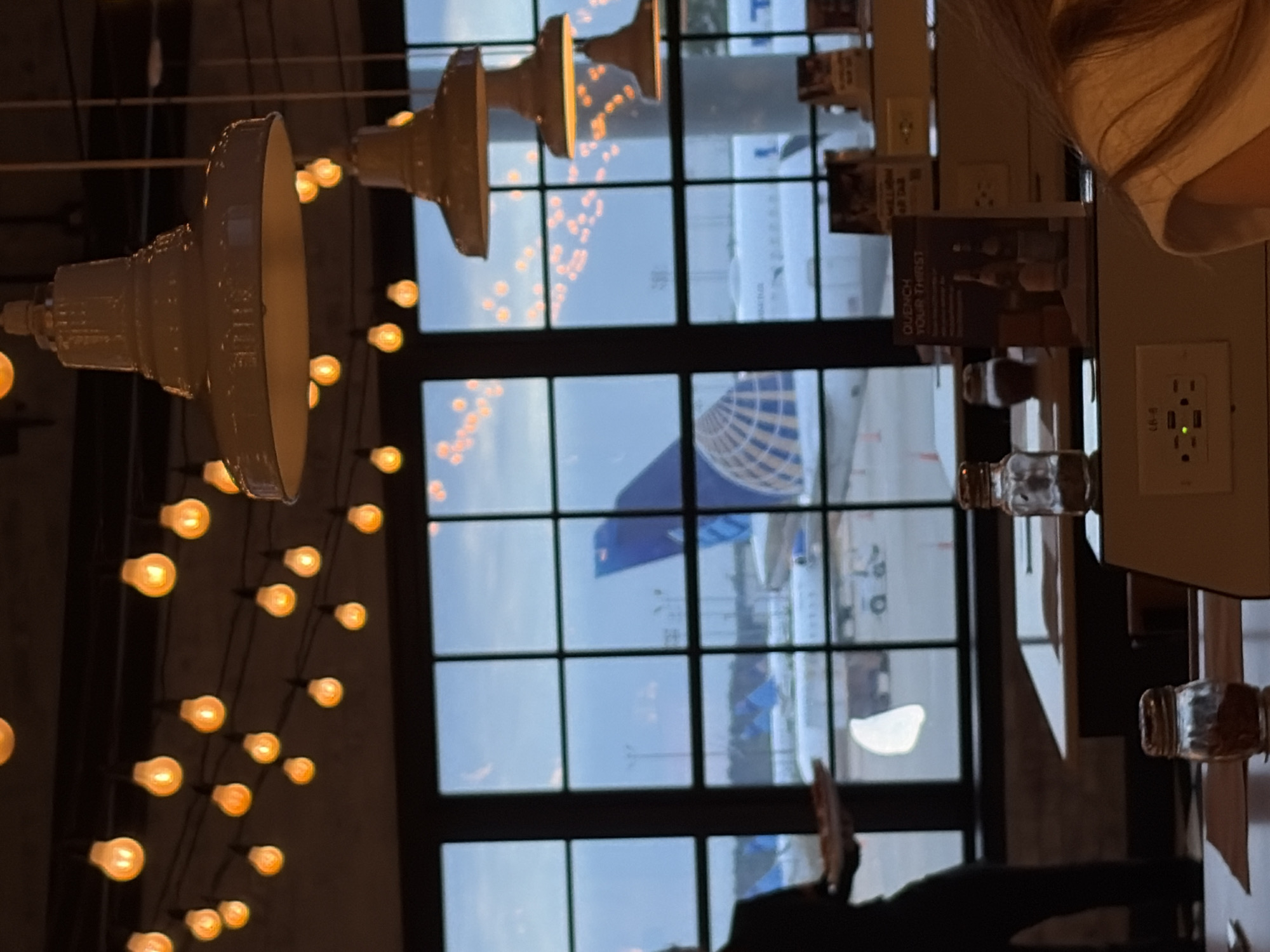 n interior view through a large window divided into small panes, likely at a restaurant or similar establishment. Outside the window, an airplane is visible, with its blue and white United Airlines tail fin clearly identifiable. This suggests the location is near an airport. Inside, there are hanging light fixtures with multiple exposed bulbs, casting a warm glow. A table is situated near the window, with menus and salt and pepper shakers visible. A person is partially visible seated at the table. The presence of a United Airlines plane outside indicates that the location is near George Bush Intercontinental Airport (IAH) in Houston, Texas, United States of America.