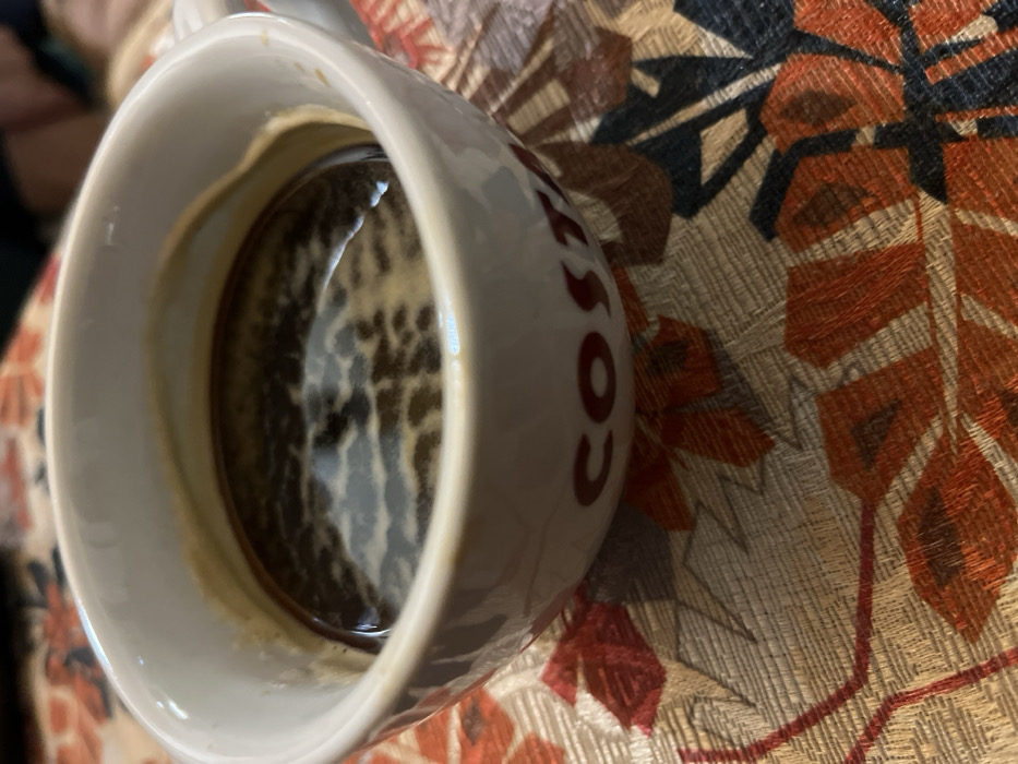 A white ceramic Costa Coffee branded cup, displaying partial red "COSTA" lettering, is positioned centrally