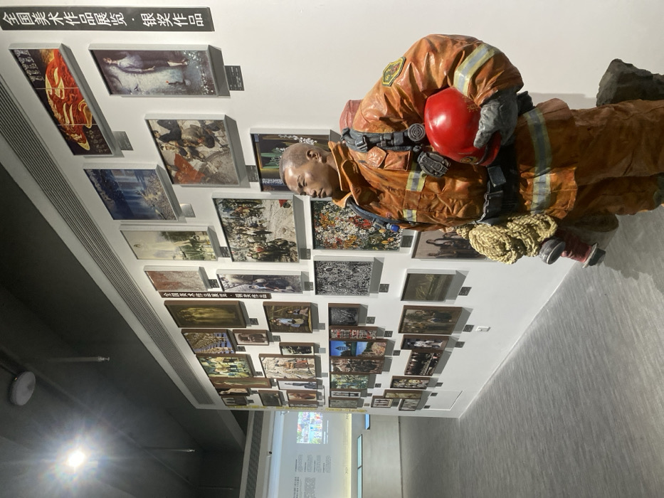 A museum wall displays framed artwork, complemented by a life-size firefighter sculpture in orange gear and a red helmet