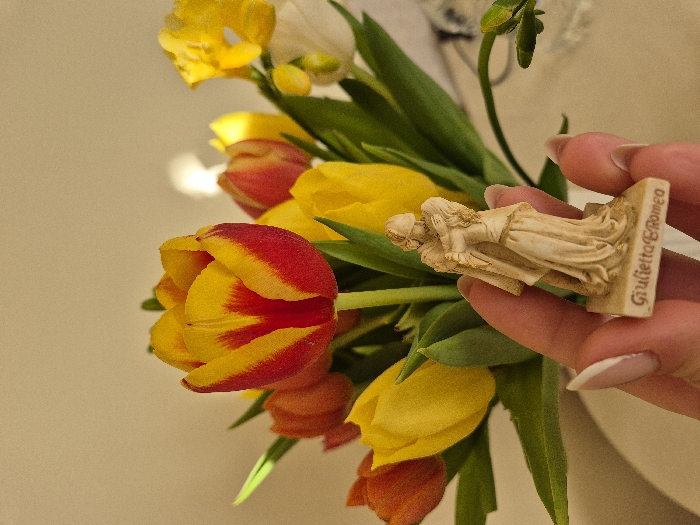 A human hand, featuring manicured fingernails with white tips, occupies the lower center of the frame, holding a small, light-colored statuette. The statuette depicts two figures embracing, with the base inscribed "Giulietta E Romeo". The scene is set against a blurred background featuring a bouquet of flowers. The bouquet prominently displays multiple tulips in shades of yellow, red, and orange, including a striking yellow tulip with a distinct red vertical stripe. Additional yellow, freesia-like flowers and green foliage are visible. The flowers are arranged in a partially visible light-colored vase. The environment consists of a plain, light-colored wall serving as the background, suggesting an indoor setting. The specific location within the city of Varna, Bulgaria, cannot be identified from the visual information presented in the image.