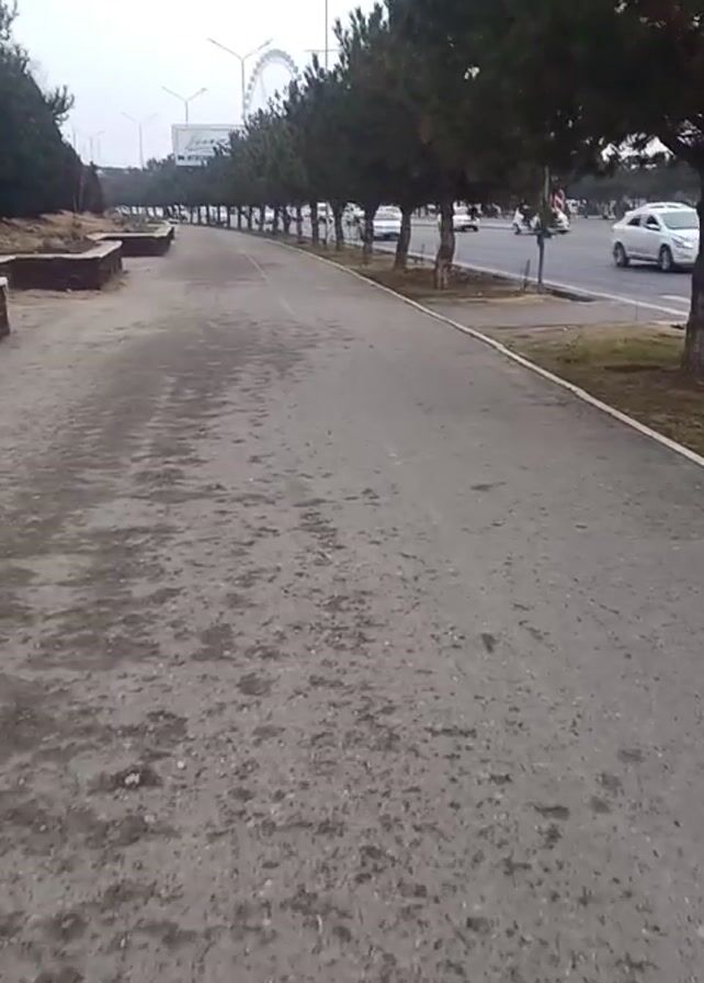 long, empty, gray pedestrian path running alongside a road with moderate car traffic. The path is lined with a row of tall, green pine trees on one side, and a lower, less defined area with some benches on the other. In the distance, a large Ferris wheel is visible, suggesting an amusement park or entertainment area nearby. The sky is overcast, creating a muted, slightly dull atmosphere. There are no people visible on the path or interacting within the scene. The camera appears to be stationary, offering a fixed perspective of the path and its surroundings.