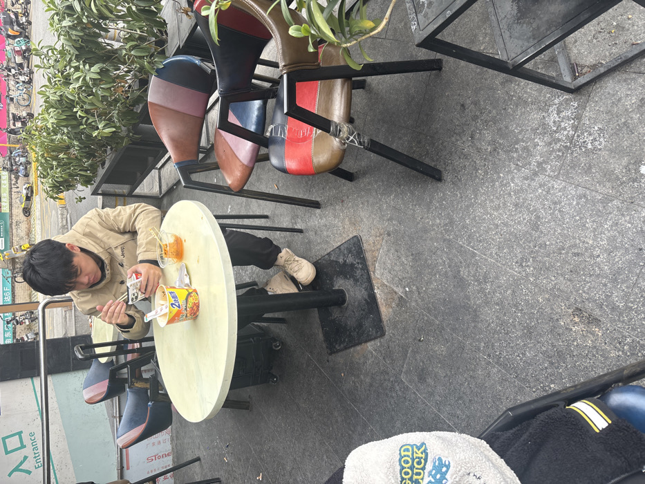 A person sits at a small, round table outdoors, eating noodles with chopsticks. The person wears a beige jacket and dark pants. On the table, there's a noodle cup, a small bowl with reddish contents, and a small, rectangular object. Seating surrounds the table, featuring colorful, patched upholstery. A potted plant sits next to the chairs. The ground is paved with gray stones. Part of another chair with a blue seat and a jacket with the words "Good Luck" can be seen.