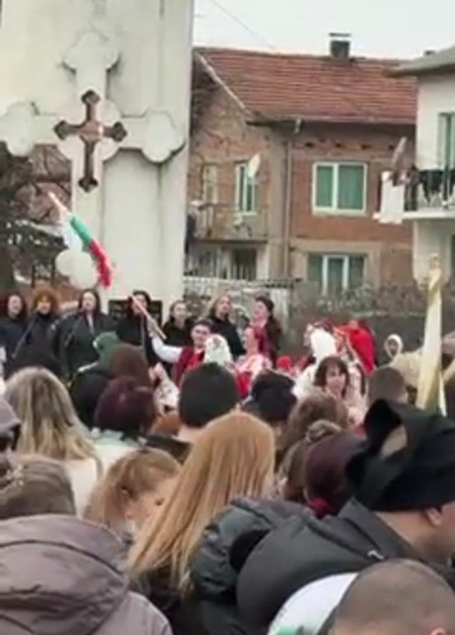 large crowd of people gathered outside in what appears to be a town square. In the background, a group of women are singing in front of a monument topped with a cross. One woman holds a Bulgarian flag. The crowd is diverse in age and dress. The weather looks overcast. Buildings can be seen in the background. The general atmosphere appears festive and communal.