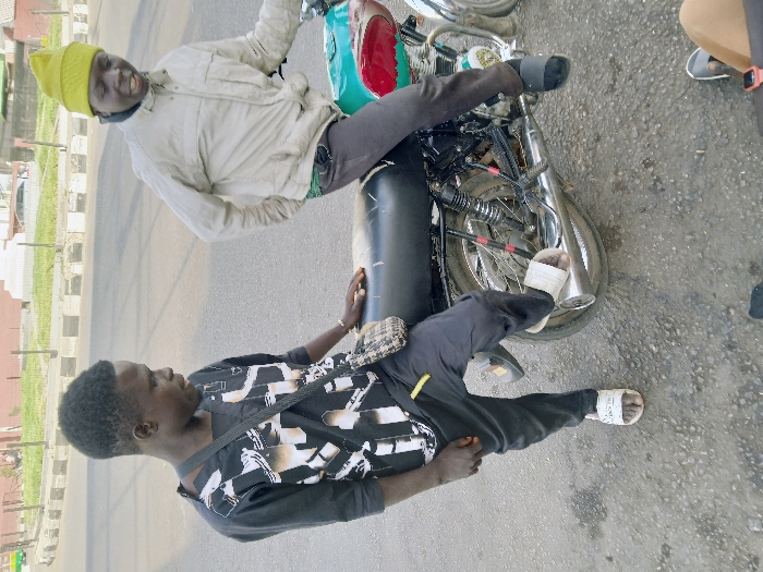 Two men perch atop a motorbike. The man in the front wears a yellow beanie, light jacket, and dark pants. The man in the back has on a dark shirt with a white abstract pattern, dark pants, and a crossbody bag. Both men wear slides. The motorbike is parked on a paved street, near some buildings. Other individuals are partially visible in the background.
