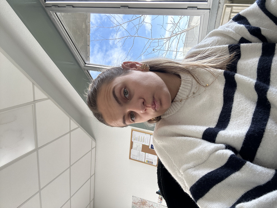 The scene depicts a female subject positioned indoors, stated to be located in Saint-Étienne, France. The subject, centrally framed with a slight head tilt, is looking directly at the camera with her lips pursed in a pout. She has light brown hair, partially pulled back, with some strands loose around her face. She wears a cream-colored, chunky knit sweater featuring two horizontal navy blue stripes across the chest and sleeves. Adorning her neck are multiple delicate gold-colored layered necklaces with small pendants, and she wears ornate, gold-colored earrings. The indoor environment includes a white acoustical tile drop ceiling with a visible grid. The walls are white with a textured finish, and a section above the window frame is painted light green. To the subject's left, a wooden-framed bulletin board with various pinned documents and a partial view of a folded map are visible against the wall. A large window on the right side of the frame reveals an outdoor view of bare tree branches silhouetted against a bright blue sky with scattered white clouds. A radiator is partially visible below the window on the right. A dark, possibly black, object (likely a chair or clothing) is visible on the far left edge of the frame.