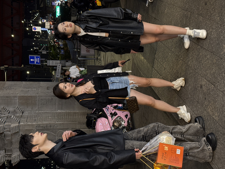 The image captures three individuals standing on a paved sidewalk at night in Yuzhong District, China, positioned next to a large, intricately carved stone column, indicative of a bridge or elevated structure. From left to right: A young male, with dark hair and a visible tattoo on his left neck/shoulder, wears a black leather jacket, faded grey wide-leg jeans, and black platform shoes. He holds two shopping bags (one clear plastic, one orange box) in his left hand and looks to the left in profile. Next to him is a young female with brown hair, wearing a black open jacket over a black lace crop top, ripped light-wash denim shorts, and white athletic shoes. She carries a small brown Louis Vuitton monogram handbag on her right shoulder and holds a black object (possibly a flashlight or phone) in her left hand, looking slightly right of the camera. Behind her and the male, a pink Suzuki GSX-R1000 sport motorcycle is parked, with a black helmet resting on its seat. To her right stands another young female, with dark hair and small glitter accents on her face. She wears a black faux leather button-up shirt over a white crop top, black shorts, and white athletic shoes with white socks. She holds a black object in her left hand and looks upwards and to the right. The background reveals a bustling urban street scene with multiple vehicles, streetlights, and illuminated buildings. Metal railings line the street, and various Chinese street signs are visible, including one with an arrow pointing right and the text "地下停车场" (Underground Parking Lot).