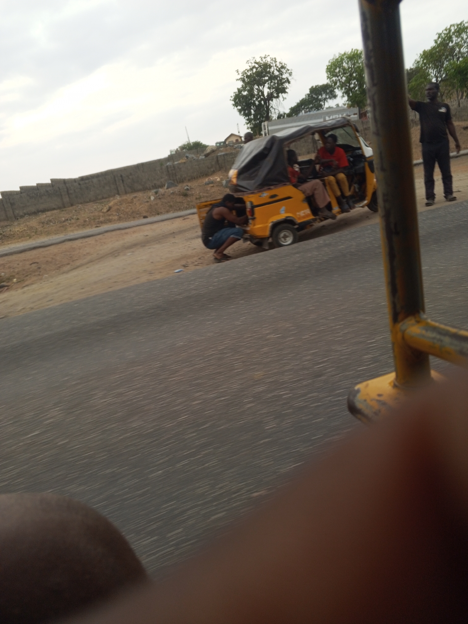 The image depicts an outdoor scene in Lokoja, Nigeria, under an overcast sky, viewed from a slightly elevated, moving perspective, indicated by motion blur in the foreground. In the midground, a yellow tricycle taxi (Keke Napep) with a black soft-top roof is positioned on the edge of a grey asphalt road, adjacent to a dirt shoulder. **Subjects and Actions:** * A male individual, dressed in a dark tank top and blue shorts, is squatting near the rear left wheel of the yellow tricycle, appearing to examine or attend to it. * Inside the tricycle, a male in a red t-shirt is seated in the driver's position, and another male, wearing light brown trousers, occupies a passenger seat behind him. * To the right of the tricycle, a male wearing a black t-shirt and black trousers stands with his right arm raised, extended forward and slightly upward, as if pointing or gesturing. **Environment:** * The immediate foreground shows a blurred dark limb on the bottom left and a yellow metal frame on the right, suggesting part of the viewing vehicle. * Behind the dirt shoulder on the left, a long, stepped concrete block wall runs horizontally across the mid-background. * Beyond the wall and the tricycle, sparse green trees are visible, along with distant, indistinct structures on a higher elevation. A large, light-colored vehicle or trailer is partially visible behind the Keke. The sky is uniformly cloudy and light grey.