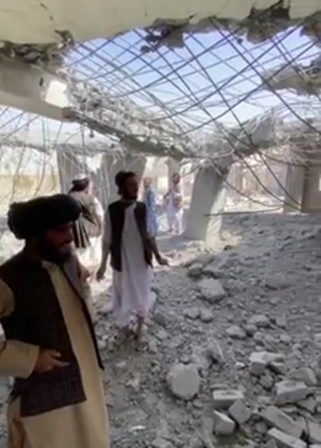 group of men standing inside a destroyed building. The ceiling has collapsed, with twisted metal and debris scattered throughout the area. The men are dressed in traditional clothing, and they appear to be surveying the damage. Some of them are talking, while others are looking around. The building seems to be located in an outdoor setting, and the weather appears to be clear and sunny.