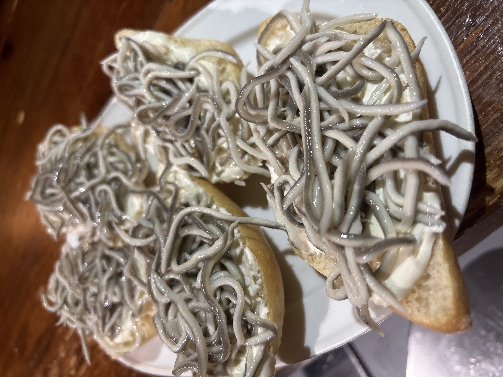A white ceramic plate, positioned on a dark brown, reflective wooden surface, displays six small bread slices. Each slice is topped with a white creamy spread and a dense cluster of thin, off-white to grayish, noodle-like strands, identified as *gulas* (imitation baby eels) or *angulas* (baby eels). The food items are the sole subjects of the image. No individuals, actions, or specific identifying architectural or environmental features pointing to Piedrahíta, Spain, are discernible within the frame.