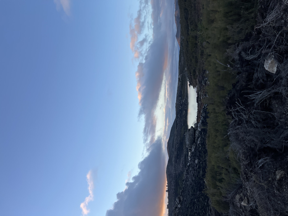 A landscape view reveals a tranquil pond mirroring the sky. The sky is blue with long grey clouds and a touch of orange. Adjacent to the water lies a rocky terrain transitioning into a field of low-lying greenery and dry brush. Mountain peaks are visible in the distance.