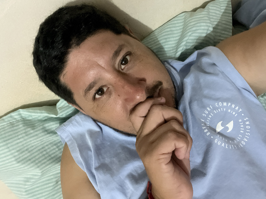 The image depicts a single male individual, estimated to be between 30 and 40 years of age, with medium skin tone, short dark hair, and a dark mustache. He has brown eyes and facial lines visible on his forehead. The individual is positioned diagonally, lying down, with his head resting on a light green and white striped pillow against a plain light-colored wall, likely indoors in Bernal Este, Argentina. He is wearing a light blue short-sleeved t-shirt featuring a white circular logo on the chest. The logo text reads "BREFFE SURF COMPANY ESTABLISHED SIXTY NINE QUALITY WELLS BEACH PROVISIONS" surrounding a stylized wave icon. His right hand is raised, with fingers partially covering his mouth and nose area. A red bracelet or band is visible on his right wrist. The individual is looking directly into the camera with a neutral expression.
