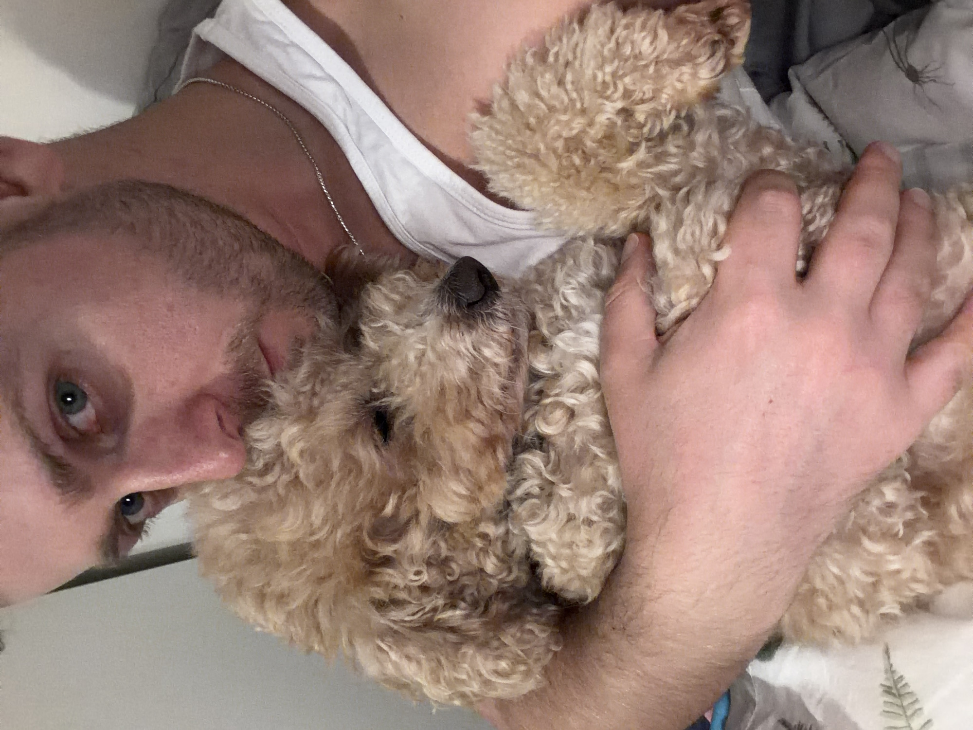 A selfie captures a fair-skinned person with short blond hair and blue eyes. They have stubble growth on their face. The person is wearing a white tank top and a silver chain is visible around their neck. Cradled in their arms is a light brown poodle. The person's right hand is visible, resting on the dog. The background is a gray and white patterned bedspread. The photo appears to be taken indoors, possibly in a bedroom. There is no evidence to suggest the image was taken in London, United Kingdom.