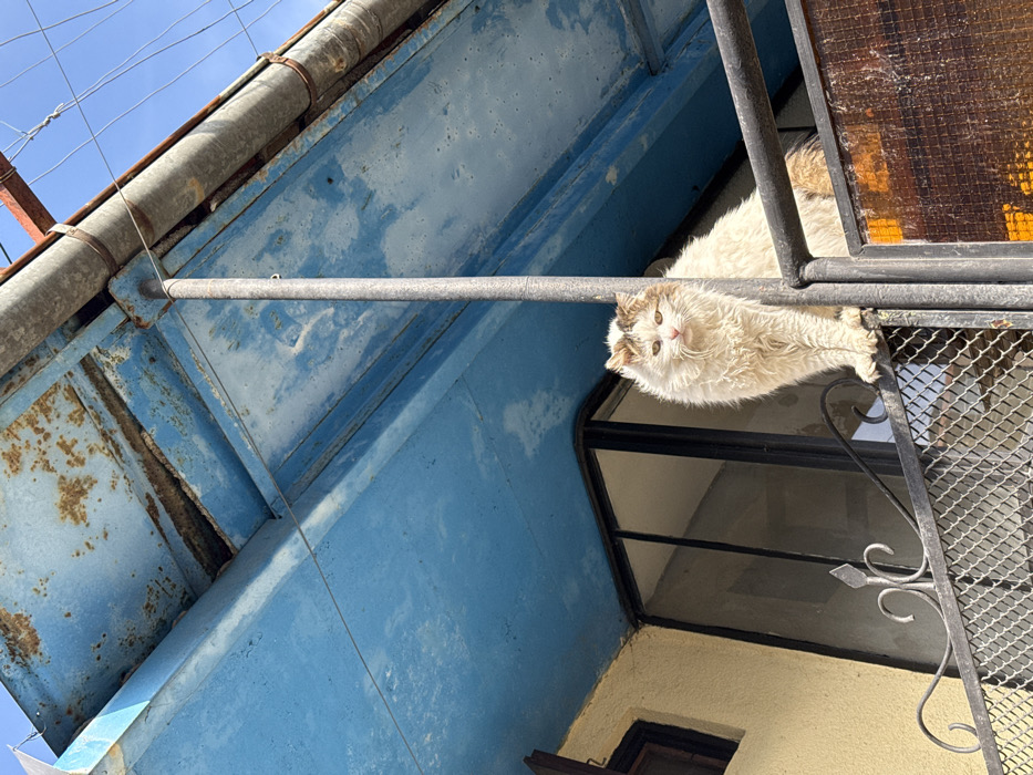 - "A long-haired, matted white cat with brown-tabby markings on its head and tail is observed sitting on a metal balcony railing" by FM-GCb712, licensed under CC BY 4.0