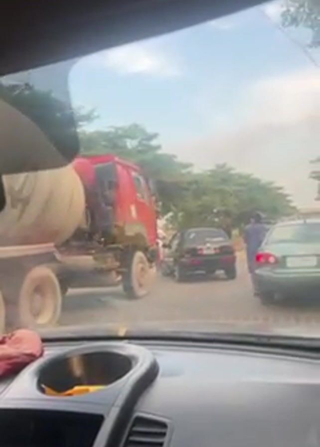 From the perspective of someone inside a car, the video shows a red cement truck that is stopped and taking up a large portion of a road. Other cars are visible on the road including a black car, a green car, and a tricycle. There are people standing on the side of the road near the cement truck. Trees line the side of the road. The sky is light blue with some clouds.