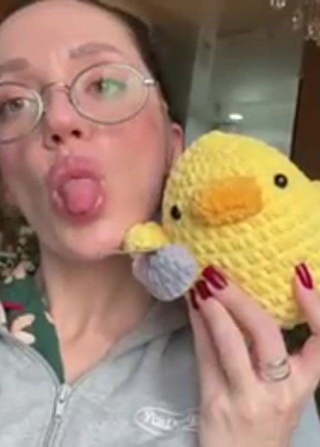 A woman with glasses holds up a crocheted yellow chick with an attached grey pom-pom in a selfie video