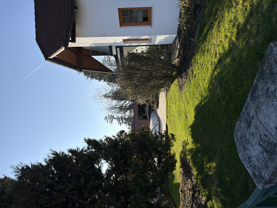 The image depicts a residential scene in Ferschnitz, Austria, under bright daylight with a clear blue sky. A distinct white contrail is visible diagonally across the upper right quadrant of the sky. In the immediate foreground, a weathered, light-gray stone pillar or cap of a boundary structure is partially visible at the bottom left, with a section of a green metal railing below it. The ground immediately beyond this structure is covered in vibrant green grass, which receives direct sunlight, creating strong shadows from unseen objects to the left. The midground features a large, dark green coniferous tree on the left, casting a substantial shadow onto the lawn. To the right of the lawn, a deciduous bush with sparse, brown foliage stands near the corner of a building. In the background, on the right, a multi-story building with white stucco walls and a brown tiled gabled roof is prominent. It features wooden eaves, a small balcony with a glass railing on its upper level, and a rectangular window with a light brown wooden frame on the lower visible section. Sunlight illuminates the right side of this structure. Further left, behind the main coniferous tree, an outdoor patio area is visible, paved with light-colored, irregular flagstones. On this patio, a translucent, dome-shaped cover, consistent with a pool enclosure, is present. Behind the patio, a modern structure with dark paneling and reflective windows is partially obscured by trees. Scattered throughout the background are various trees, some coniferous and others deciduous, largely bare of leaves, suggesting a cooler season. No individuals or active subjects are present.