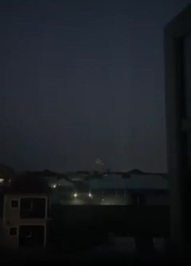 fireworks exploding in the night sky over a residential area. The fireworks are orange and yellow and burst in clusters. The sky is dark and the houses are silhouetted against the horizon, with a few lights visible in some windows. The video is shot from an elevated position, possibly from a window or balcony. A window frame is visible in the right of the frame.