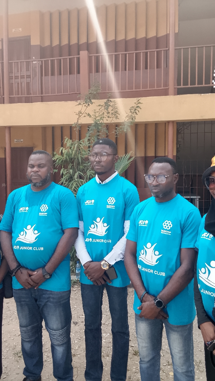 four men standing outside a building in Street, Nigeria, located at the coordinates 6.487 latitude and 3.36 longitude. The men are all wearing blue t-shirts with a white logo that says "JCI Junior Club" and the word "BLUESCHIP" underneath the logo. The building appears to be a school or a community center, as there is a sign that says "Junior Chamber International" on the building, and it is an older building with a second-story balcony. The men are all wearing jeans and looking at the camera. The man on the left is wearing a black watch, the man in the middle is wearing a gold watch and holding a cell phone. The man on the far right is wearing a black bracelet and the man next to him is wearing a gold bracelet. The ground in front of them is dirt. There is a small bush behind the man on the left. The sun is shining brightly, casting a glare on the ground.