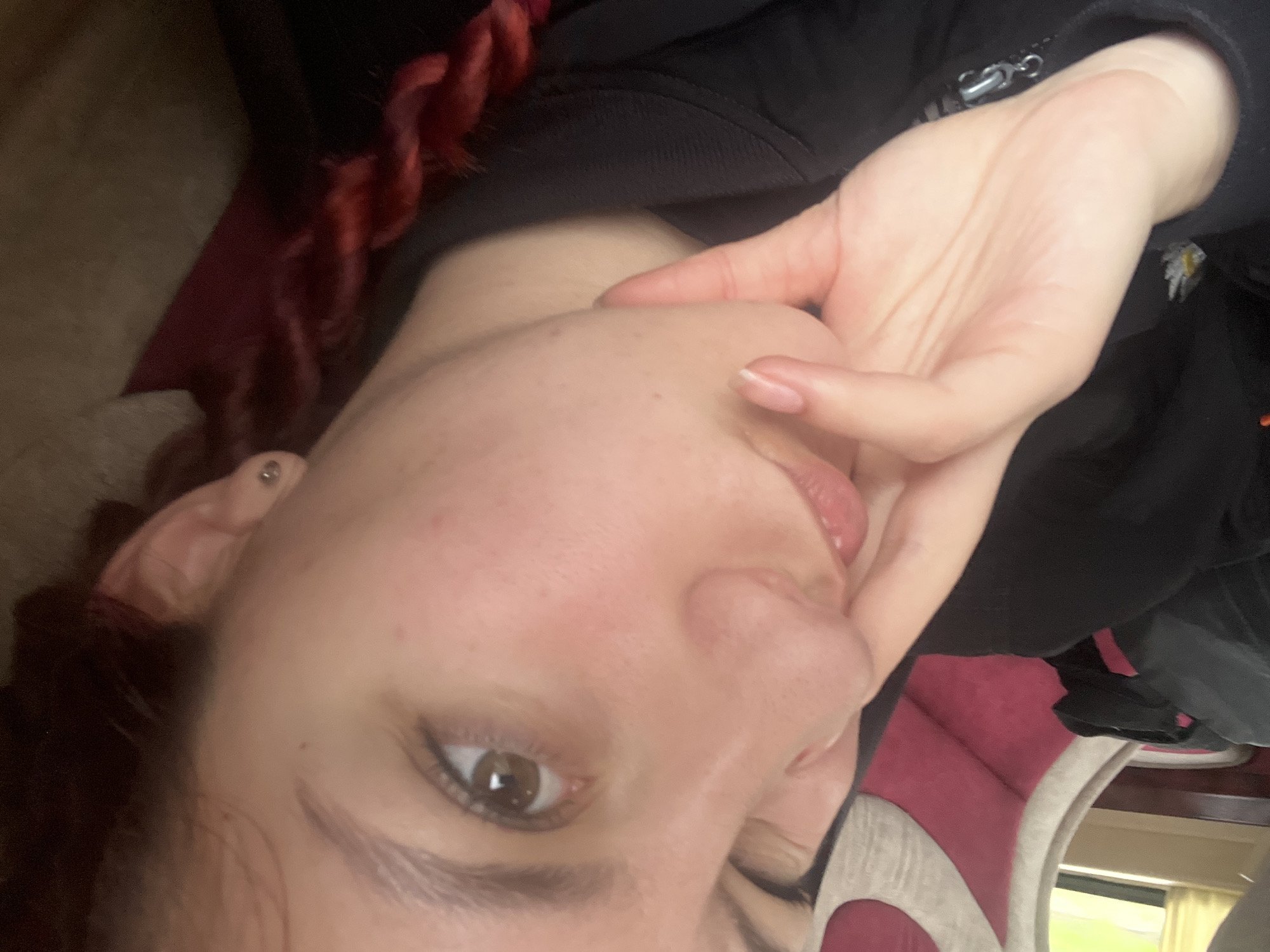 A close-up, slightly out-of-focus selfie of a woman with fair skin and brown eyes. Her red hair is visible, braided in the background. She is wearing a black hooded sweatshirt. Her hand is raised to her face, with her fingers touching her cheek and lips. A piercing is visible in her ear. The background shows a pink and gray patterned seat, and a glimpse of a window suggesting an indoor setting, likely a vehicle such as a bus or train. There is no information that explicitly places the image within the city of Kalugerovo, Bulgaria.