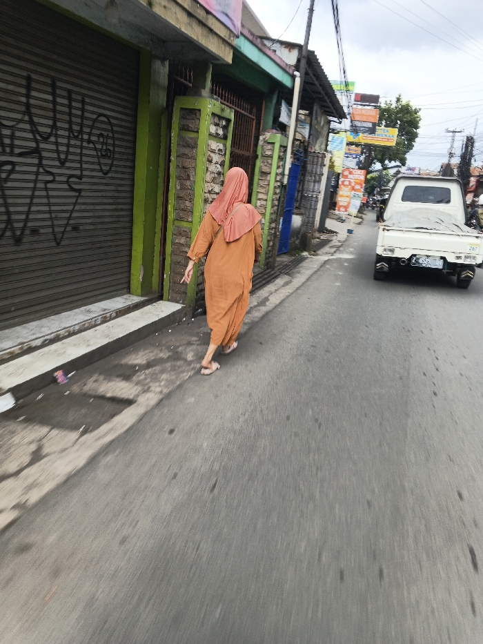 The scene depicts an outdoor street in Margahayu, Indonesia, under an overcast sky. A single individual, viewed from behind, walks along the left edge of an asphalt road. This person wears an orange-brown long dress or robe and a matching orange-brown hijab, with light-colored sandals. To the individual's immediate left, a concrete curb borders a building facade. This facade includes a closed, graffiti-covered gray corrugated metal roll-down shutter and a green-painted structure with stone accents. Further along the street on the left, additional building facades and utility structures are visible. On the right side of the road, a white pickup truck with a light-colored tarp covering its bed is seen from the rear, positioned facing away from the camera. Multiple commercial signs of varying sizes, utility poles, and overhead wires are visible lining the street in the distance. The asphalt road surface appears worn with minor markings. Green foliage from a tree is visible in the upper right background.