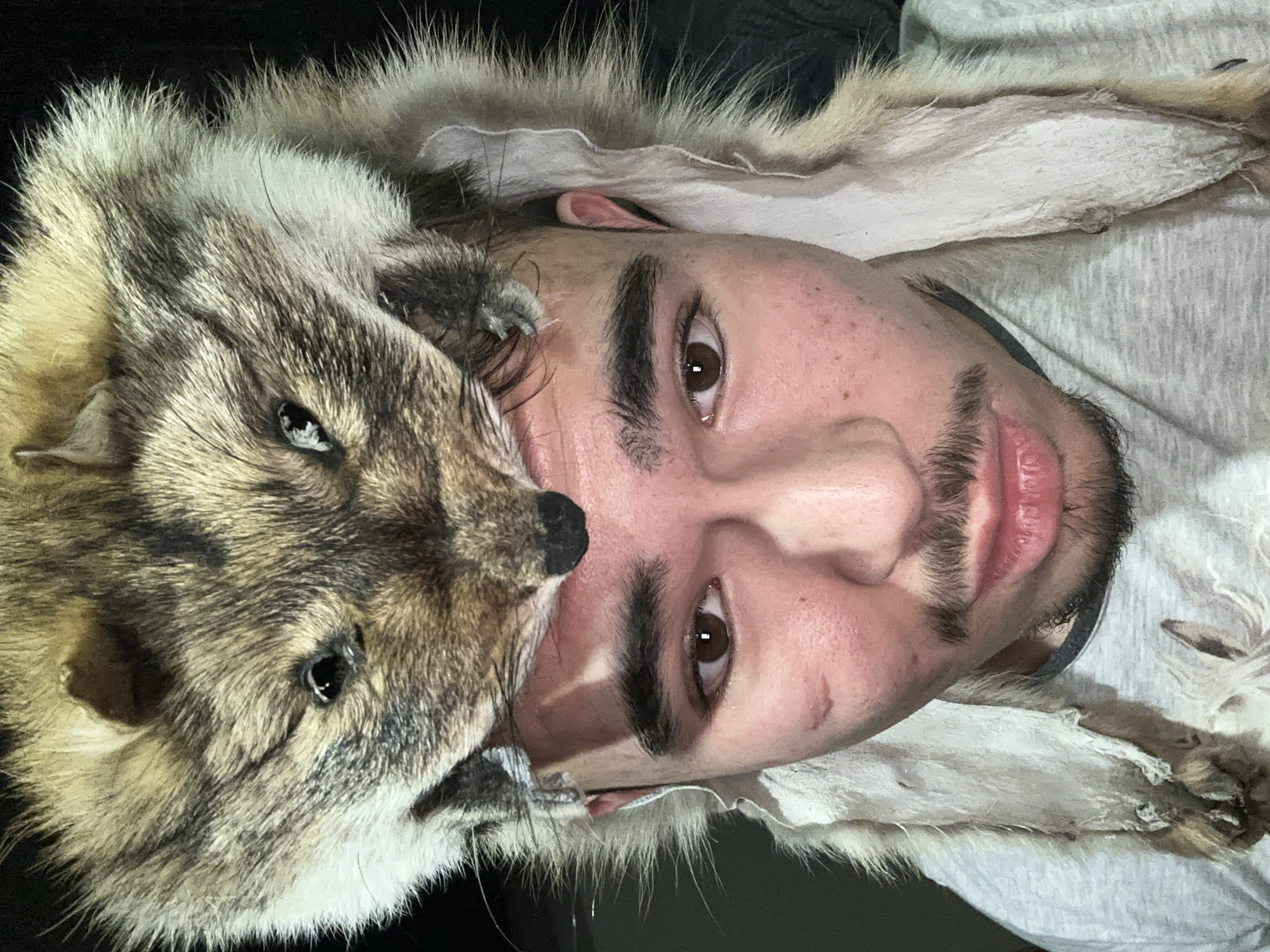 A close-up portrait depicts a young adult male with a neutral expression, gazing directly into the camera. He is wearing a headwear item crafted from animal fur, specifically the taxidermied head and pelt of what appears to be a canid, possibly a coyote, positioned on his head with the animal's face centered above his forehead. The fur exhibits light brown, tan, and dark brown coloration, with dark, reflective artificial eyes and a dark snout present on the animal head. The male subject has dark brown eyes, short dark hair visible at the forehead, and a dark mustache and goatee. A prominent reddish-brown scar is visible on his left cheekbone (viewer's left). He is dressed in a light grey t-shirt with a darker collar visible beneath. The background is uniformly dark and out of focus, providing no discernible environmental details. The precise location in Voluyak, Bulgaria, or any other specific geographical location, cannot be determined from the visual information provided in the image.