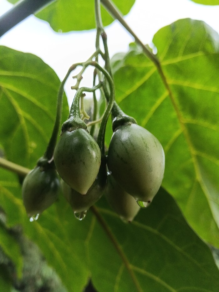 - "A cluster of unripe green fruits hangs from a plant, each fruit glistening with water droplets" by FM-D2rLt1, licensed under CC BY 4.0