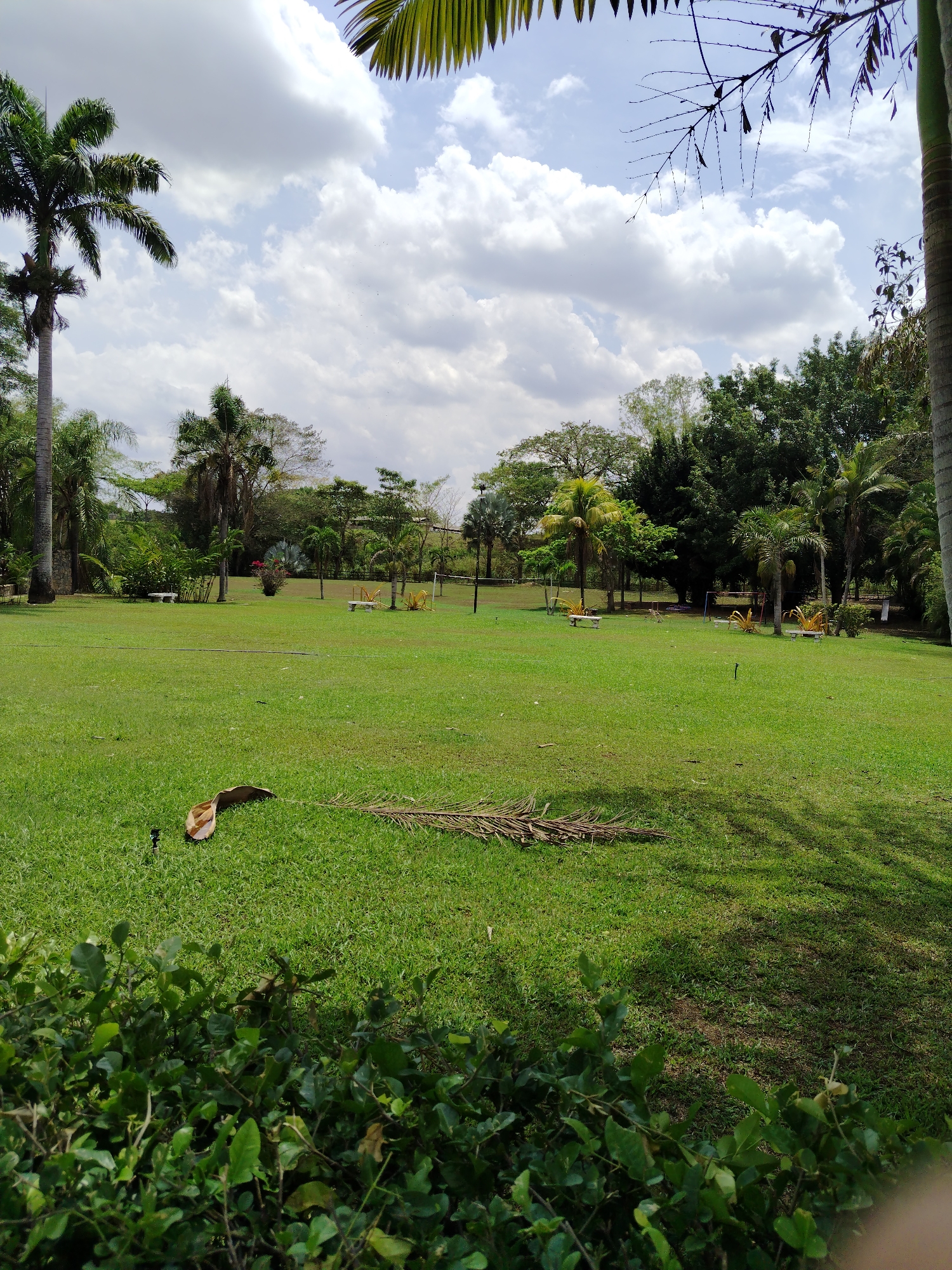 The image depicts a park or open green space with trees and vegetation under a cloudy sky. The location appears to be Marta, Venezuela. Foreground: A bush or hedge is visible in the immediate foreground, partially obscuring the view. Midground: A large, well-maintained grassy area dominates the midground. There is a fallen palm leaf on the grass. Several trees, including palm trees, are scattered throughout the midground, and there are park benches and playground equipment in the distance. Background: A line of trees forms the background, with the sky filled with white clouds visible above the trees. Overall, the scene suggests a peaceful and natural environment, likely a park or recreational area in the city of Marta, Venezuela. There are no people visible in the image.