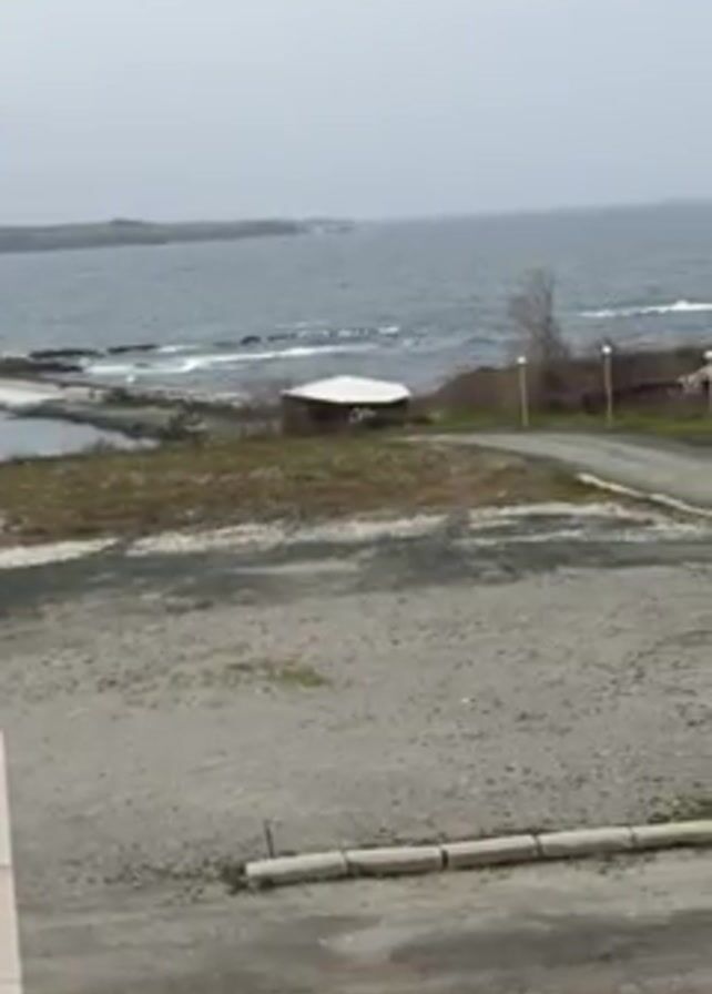 view of the sea from a high vantage point, likely a building window. The sea is visible in the background, with small waves breaking near the shore. A small, rectangular building with a white roof sits on the shoreline. A paved road extends from the building towards the right side of the frame, lined with light posts. In the foreground, there's a large, empty, grey gravel area with a row of concrete barriers. The sky is overcast and appears to be a hazy grey.