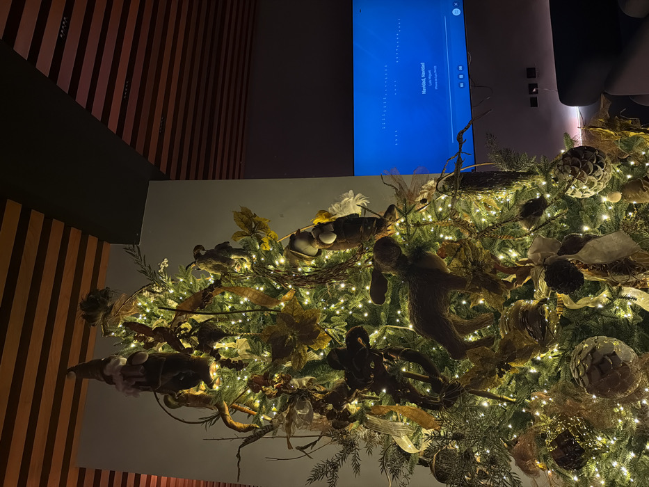 A decorated Christmas tree is illuminated with white lights and adorned with feathers, gold ornaments, and what appear to be stuffed animals. The tree sits on a shelf or ledge in front of a wall with vertical wood paneling. Above the tree is a blue screen displaying text. A dark shape is positioned above and to the right of the screen. The lighting in the room is dim, creating a warm, festive atmosphere.